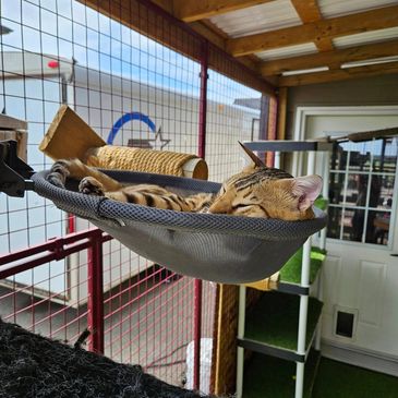 I've had a few people ask where I got my catio hammock. Its wall mountable indoor but we put it in our catio. The fabric is mesh so it dries fast if it gets wet. The hammock can fold up for storage. Its not very deep but Kona was able to fit in it.